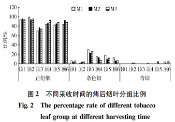 本研究認(rèn)為,湖南江華煙區(qū)烤煙上部煙葉適宜采收成熟度為M1~M2,即葉片顏色黃綠至變黃50%,部分茸毛脫落,主脈變白,支脈變白50%,葉緣微卷曲,葉尖下勾,40%的葉面出現(xiàn)成熟斑。