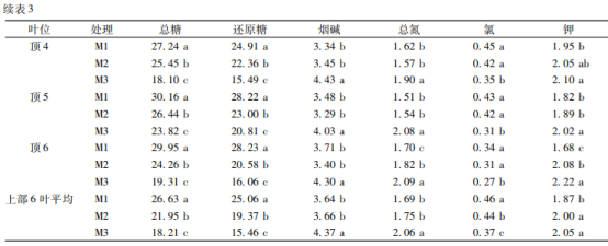 由表3可知,延遲采收時(shí)間會(huì)導(dǎo)致上部煙葉的總糖和還原糖含量下降,從頂1~6葉位,煙葉總糖和還原糖含量均是M1>M2>M3,且達(dá)到了差異顯著性水平(P<0.05),特別是部分葉位M3處理總糖含量在20%以下,不受企業(yè)歡迎。延遲采收時(shí)間,導(dǎo)致上部煙葉的煙堿含量提高,除頂3(3個(gè)成熟度處理煙堿含量差異顯著)外,頂1、2和頂4~6葉位的煙堿含量M3顯著大于M1、M2;所有處理的上部煙葉的煙堿含量均偏高,M3處理的煙堿含量在4.5%以上。延遲采收時(shí)間,導(dǎo)致上部煙葉的總氮含量顯著提高,M3處理的煙葉總氮含量顯著高于M1。延遲采收會(huì)提高上部煙葉鉀含量,從頂1~6葉位,煙葉鉀含量均是M3>M2>M1。延遲采收降低上部煙葉氯含量,M3的煙葉氯含量顯著低于M1。