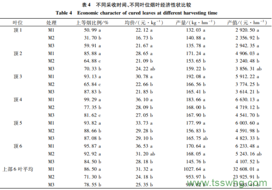 由表4可知,除頂1葉位外,M3的上等煙比例均顯著小于M1。除頂1、2葉位外,M3的均價(jià)均顯著低于M1。除頂1、5葉位外,M3產(chǎn)量均顯著低于M1。除頂1、2葉位外,M3產(chǎn)值均顯著小于M1??傮w上看,延遲采收時(shí)間,會(huì)降低上等煙比例和均價(jià),降低產(chǎn)量和產(chǎn)值。