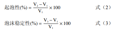 定取500mg銀杏蛋白分散于15mL0.01mol·L-1磷酸鹽緩沖溶液(pH7.0)中,記錄初始體積為V1(mL),10000r/min均質(zhì)2min,記錄泡沫體積為V2(mL),靜置30min記錄體積記為V3(mL)。銀杏蛋白起泡性和泡沫穩(wěn)定性的計算公式如下: