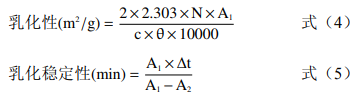 式中:N為稀釋倍數(shù);A1和A2分別為0和30min時的吸光度;c為蛋白濃度,g/mL;θ為乳液中油相體積分數(shù);Δt為兩次吸光度測定的間隔時間,min。