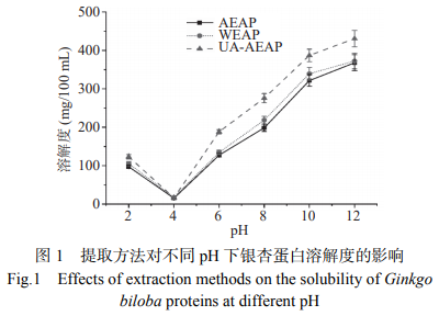 溶解度是蛋白質(zhì)的重要功能特性之一,乳化性、起泡性、起泡穩(wěn)定性等其他功能特性與溶解度密切相關(guān)。圖1為不同提取方法對不同pH下銀杏蛋白溶解度的影響。由圖1可知,隨著pH的增大,三種提取方法制備的銀杏蛋白的溶解度均先降低后升高,溶解度在pH4.0左右都達到了最小值,這與李向陽等報道的銀杏蛋白在等電點處的溶解度最低相一致。在pH2~12的范圍內(nèi),UA-AEAP銀杏蛋白的溶解度最高,WEAP蛋白的溶解度略高于AEAP蛋白。結(jié)果提示,超聲處理可提高銀杏蛋白的溶解度,可能的原因是超聲處理產(chǎn)生的空化效應可以降低蛋白質(zhì)顆粒聚集體的粒度。這與前人研究結(jié)果一致,超聲處理可顯著提高大豆親脂蛋白、鷹嘴豆分離蛋白和Oleosin蛋白的溶解度。