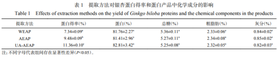 表1為提取方法對銀杏蛋白得率和蛋白制品中化學成分的影響。由表1可知,不同提取方法制備的銀杏蛋白得率存在顯著性差異(P<0.05),其中UA-AEAP蛋白得率最高,達到了11.36%±0.10%。不同提取方法制備的銀杏蛋白產(chǎn)品中蛋白、總糖、粗脂肪和灰分含量均無顯著性差異(P>0.05)。三種方法制備的銀杏蛋白純度均可以滿足功能特性分析的需要。UA-AEAP蛋白得率高,提取時間短,更加適用于銀杏蛋白的制備。