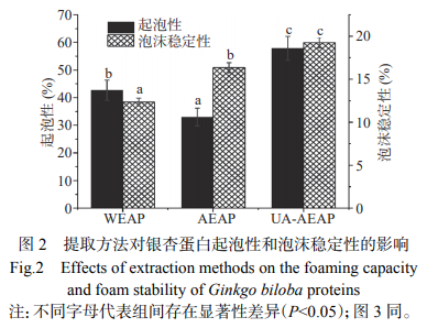 起泡性和泡沫穩(wěn)定性是蛋白質(zhì)應用于食品加工中最重要的功能特性之一,前者主要取決于蛋白質(zhì)溶液的溶解度、疏水基團的數(shù)目和肽鏈的柔韌性等因素,而后者主要取決于蛋白質(zhì)溶液的流變學性質(zhì)。圖2為不同提取方法對銀杏蛋白起泡性和泡沫穩(wěn)定性的影響。由圖2可知,UA-AEAP蛋白的起泡性和泡沫穩(wěn)定性顯著高于AEAP蛋白和WEAP蛋白(P<0.05),可能的原因是超聲產(chǎn)生的空化效應降低了銀杏蛋白顆粒聚集體的粒度,同時降低水的界面張力,有利于蛋白分子的快速擴散。AEAP蛋白的起泡性顯著低于WEAP蛋白,但泡沫穩(wěn)定性顯著高于WEAP蛋白(P<0.05),可能的原因是水提法溶液的pH更接近蛋白的等電點,被吸附到界面上的蛋白數(shù)量增加,從而提高了蛋白的起泡性。