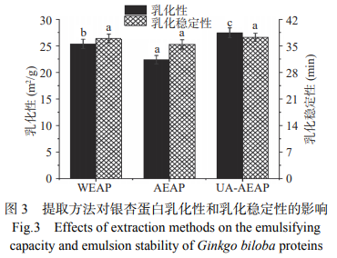 蛋白質(zhì)的乳化性能在食品加工中具有重要的意義,主要受到疏水基因的數(shù)目、界面張力等因素影響。圖3為提取方法對銀杏蛋白乳化性和乳化穩(wěn)定性的影響。由圖3可知,UA-AEAP蛋白的乳化性顯著高于AEAP蛋白和WEAP蛋白(P<0.05),可能的原因是超聲處理增加了銀杏蛋白的溶解度,抑制蛋白聚集,提高乳液界面吸附蛋白能力。WEAP蛋白的乳化性顯著高于AEAP蛋白(P<0.05),可能是因為WEAP蛋白具有更高的溶解度。三種銀杏蛋白的乳化穩(wěn)定性無顯著性差異(P>0.05)。