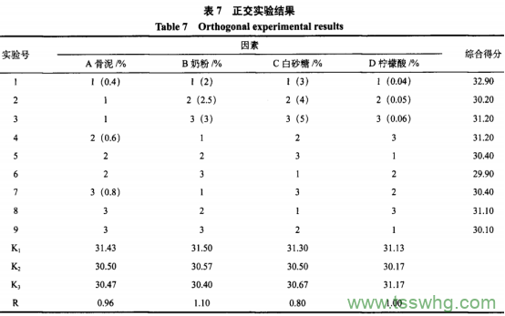 根據(jù)方差分析結(jié)果可以看出A(骨泥添加量)、B(奶粉添加量)、C(白砂糖添加量)和D(檸檬酸添加量)對骨泥高鈣豆奶的感官分析有顯著影響(P<0.05),其影響順序為:A>B>D>C。結(jié)合K值可知,最優(yōu)的配方為A1B1C1D3,即骨泥添加量為0.4%,奶粉添加量為2%,白砂糖添加量為3%,檸檬酸添加量為0.06%。