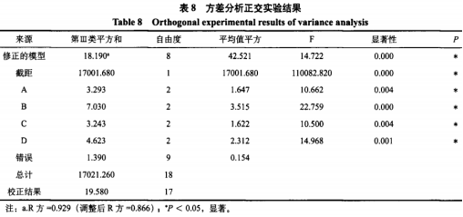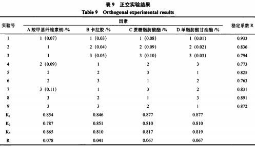 2、根據(jù)單因素實驗結(jié)果,選擇羧甲基纖維素鈉、卡拉膠、蔗糖脂肪酸酯和單脂肪酸甘油酯四個變量的最佳使用量范圍,并選定三個水平進行復配實驗,其實驗結(jié)果見表9。