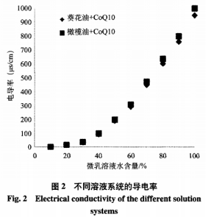 為了更好地理解界面處系統(tǒng)的溶解能力,判 斷微乳的類型,沿稀釋線研究了溶液的電導(dǎo)率。 o/w型微乳液具有較大的電導(dǎo)率,而以油為連續(xù) 相的w/o型微乳則電導(dǎo)率較低;當(dāng)發(fā)生相轉(zhuǎn)變 時,電導(dǎo)率有明顯的突變,常被用來指示乳液的 轉(zhuǎn)相。由圖2可看出隨著稀釋時水量的不斷增 加導(dǎo)電導(dǎo)率也不斷增大,但在不同含量水時增大 的幅度不同,當(dāng)含水量在0%~20%時電導(dǎo)率 非常小幾乎為零,表明在該含水量時微乳的類型 油包水型,因?yàn)閹缀醪淮嬖谟坞x態(tài)的水。當(dāng)含水 量為30%~50%時溶液的電導(dǎo)率呈現(xiàn)加速度增加,表明該含水量下微乳表現(xiàn)為雙連續(xù)型結(jié)構(gòu),有一定的游離水存在。當(dāng)含水量達(dá)到并超過60%時電導(dǎo)率增加幅度達(dá)到最大,并保持不變,幾乎成一元線性增長,表明此時微乳轉(zhuǎn)變?yōu)閛/w類型。從圖中可以看出線性發(fā)生拐點(diǎn)的位置大約是20%~30%和50%~60%處,表明在這位置處微乳的類型發(fā)生了變化,同時,兩種微乳液在相同電導(dǎo)率值都基本相同,表明油和CoQl0對微乳類型的變化幾乎不產(chǎn)生影響。