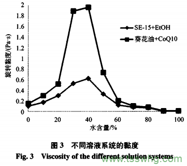 為了表征輔酶Q10微乳系統(tǒng),沿稀釋線對空白系統(tǒng)和溶解輔酶Q10微乳溶液的黏度進(jìn)行了對比研究,試驗(yàn)結(jié)果表明,這兩種微乳液的黏度隨著含水量逐漸增加先增加后降低,其中當(dāng)含水量在30%-50%時的黏度遠(yuǎn)遠(yuǎn)高于其他階段的,表明該階段正處于混亂狀態(tài)的雙連續(xù)相,由于極性基團(tuán)和非極性基團(tuán)不能有序排列,所以黏度大幅度增大,之后隨著加水量的增加,相發(fā)生變化,黏度快速降低。從黏度圖上也可以表明,低含水量時微乳液為連續(xù)相W/O微乳液,含水量達(dá)到30%~50%時為雙連續(xù)結(jié)構(gòu)相,含水量達(dá)到60%時相發(fā)生反轉(zhuǎn),轉(zhuǎn)變?yōu)檫B續(xù)相OAV型的水包油型微乳溶液,連續(xù)相是水性的并且黏度下降。同時也說明了油包水型的微乳溶液的黏度大于水包油型的黏度,表明大分子的非極性物質(zhì)是形成黏度的主要貢獻(xiàn)者。將兩條黏度線進(jìn)行比較時就會發(fā)現(xiàn),當(dāng)含水量相同時輔酶Q10微乳溶液的黏度始終大于空白系統(tǒng)的,這與輔酶Q10微乳溶液溶解較多非極性化合物有關(guān),當(dāng)是當(dāng)加水稀釋至含水量達(dá)到60%時,二者黏度就相差不大了,表明此時溶解的非極性化合物對整個微乳溶液的黏度影響可以忽略了。