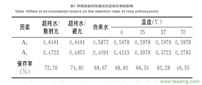 3.5,說明肉眼都不能觀察到變化。在避光條件下,自來水提取液和超純水提取液放置150h后,玫瑰花色苷保存率分別為69.67%和74.80%。兩種水質造成的差別可能是由于自來水中的金屬離子及雜質,這些物質與花色苷發(fā)生反應,導致自來水提取液的顏色變化以及花色苷保存率大于超純水提取液。但從兩種提取液的顏色變化和花色苷保存率來看,水質對玫瑰花色苷水提液顏色穩(wěn)定性的影響較小。