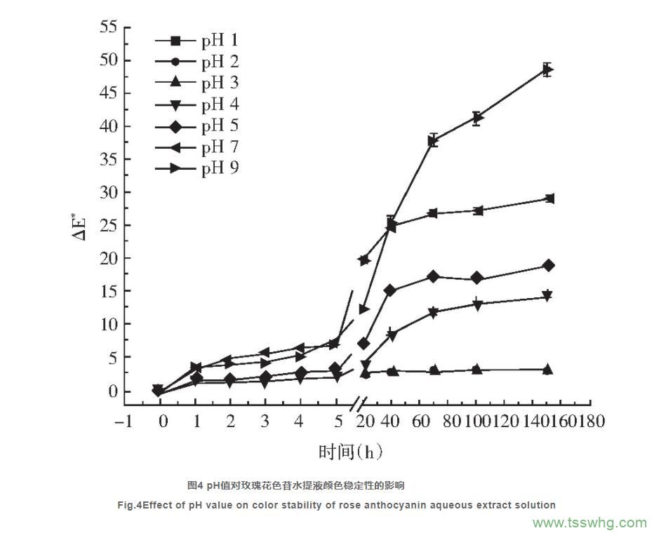 試驗過程中觀測到pH值為1~3時,玫瑰花色苷水提液初始顏色為深紅色,玫瑰花色苷保存率均高于70%,pH值為1時玫瑰花色苷保存率最高達到了78.18%。pH值為4~5時,玫瑰花色苷水提液初始顏色為淺紅色,0~150h色差隨時間的增加而增大,玫瑰花色苷保存率低于60%。pH值為7~9時,玫瑰花色苷水提液初始顏色為墨綠色,室溫條件下避光保存1h后色差迅速增大,達到肉眼可觀察到的程度,150h時△E*值最大,達到48.78,而玫瑰花色苷保存率僅有33.21%。pH值對玫瑰花色苷水提液顏色穩(wěn)定性的影響較大,這是因為花色苷分子中除了有酸性的酚羥基外,其吡喃環(huán)上還有一個具有堿性的四價氧原子,溶液的pH值不同,花色苷存在于溶液中的結構不同。從試驗結果看,玫瑰花色苷在酸性條件下的穩(wěn)定性高于堿性條件,說明玫瑰花色苷適用于酸性飲料的加工。