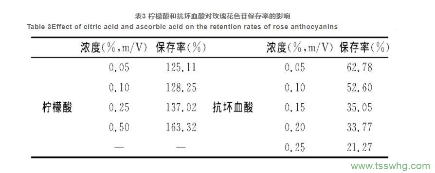 2.3.1 檸檬酸、抗壞血酸對玫瑰花色苷穩(wěn)定性的影響