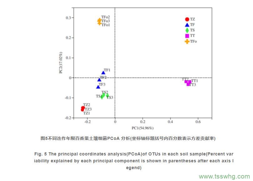 為了進(jìn)一步對(duì)細(xì)菌群落物種組成差異進(jìn)行分析,探討不同連作年限間群落細(xì)菌組成的相似性或差異性,基于Bray-Curtis距離算法,采用主坐標(biāo)分析(PCoA)對(duì)不同連作年限土壤細(xì)菌群落差異進(jìn)行分析,結(jié)果如圖5所示,在OUT水平上,PC1 與 PC2 分別解釋方差為54.96%和17.02%,累計(jì)解釋能力達(dá)71.98%,不同連作年限間土壤細(xì)菌群落差異顯著(P=0.001,R=1),撂荒地土壤樣本與百香果種植地樣本在第一主成分上很好地被區(qū)分,種植第一年(TF)與種植第二年(TS)土壤細(xì)菌群落組成較相近;每個(gè)處理的三個(gè)重復(fù)樣本的聚集性較好,顯示出較好的重復(fù)性,第一年種植的土壤細(xì)菌組內(nèi)差異較大。同時(shí),采用Bray-Curtis算法對(duì)15個(gè)土壤樣本細(xì)菌群落進(jìn)行樣本層級(jí)聚類(lèi)分析,結(jié)果表明(如圖6):15個(gè)土壤樣本明顯聚集為5組,與5個(gè)連作年限對(duì)應(yīng),其中連作3年的樣本(TT)單獨(dú)為一簇,與其他4個(gè)樣本分開(kāi);第一年種植(TF)和第二年種植(TS)的樣本與撂荒地(TZ)的相似距離較近,說(shuō)明百香果連作顯著影響土壤細(xì)菌群落結(jié)構(gòu)。