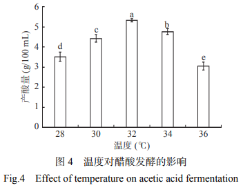 如圖4所示,發(fā)酵溫度對果醋發(fā)酵影響顯著(P<0.05)。28~32℃范圍內(nèi)果醋產(chǎn)酸量隨溫度升高而逐漸增大,溫度超過32℃,產(chǎn)酸量開始下降,溫度越高產(chǎn)酸量越低。可能是溫度過低時,醋酸菌中酶活性不夠,不足以充分發(fā)酵;而溫度過高會使醋酸菌中的酶活性失活,加速醋酸菌生長,提前老化,從而導致果醋產(chǎn)酸量降低,影響發(fā)酵效率。經(jīng)多重比較得到發(fā)酵溫度為32℃對醋酸發(fā)酵影響最為顯著(P<0.05),最終選擇32℃為響應值,30、32、34℃為三個水平進行響應面試驗分析。