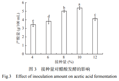 如圖3所示,不同醋酸菌接種量對果醋發(fā)酵影響顯著(P<0.05)。接種量10%時果醋產(chǎn)酸量最大,低于10%產(chǎn)酸量隨接種量增加而增大,高于10%產(chǎn)酸量開始呈現(xiàn)下降趨勢??赡苁谴姿峋臃N量過少時,發(fā)酵液中菌體不足,不能徹底發(fā)酵;而接種量過高時,發(fā)酵液中菌種增加,從而耗費大量的營養(yǎng)物質(zhì),而醋酸菌繁殖過快使得發(fā)酵后期發(fā)酵液中無微生物存在,進而產(chǎn)酸量降低。經(jīng)多重比較得到接種量10%對醋酸發(fā)酵的影響更顯著(P<0.05)。因此確定接種量10%為最佳,選擇8%、10%、12%三個接種量進行響應面試驗分析。
