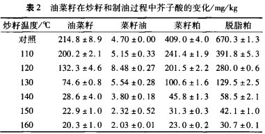 油菜籽中芥子酸的變化見表2。隨著炒籽溫度的升高,菜籽油中的芥子酸含量先增加后減少,在120℃時(shí)達(dá)到最大值,比對照增加80.4%。而油菜籽、菜籽粕和脫脂粕中的芥子酸含量均逐漸下降,在160℃時(shí),分別下降了90.5%、94.4%、95.4%。這可能是因?yàn)槲锪蠝囟壬撸孀铀岚l(fā)生熱脫羧反應(yīng)生成Canolol,因此芥子酸含量隨炒籽溫度的升高而降低。