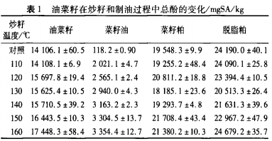 油菜籽中總酚的變化見表1。隨著炒籽溫度的升高,菜籽油中的總酚含量逐漸增加,在160℃時(shí)增加了27.4倍。油中總酚含量增加可能是由于菜籽細(xì)胞結(jié)構(gòu)被破壞,壓榨出油率增加,多酚隨油脂溶出更多,或者因?yàn)橐恍┙Y(jié)合酚的交聯(lián)結(jié)構(gòu)遭到破壞,結(jié)合酚變成游離酚而更容易隨油脂的壓榨過程釋放到油中。油菜籽中的總酚含量逐漸增加,在160℃時(shí)增加了23.7%。油菜籽中總酚增加也可能是因?yàn)槌醋杨A(yù)處理破壞了油菜籽的細(xì)胞壁和細(xì)胞膜結(jié)構(gòu),使得結(jié)合酚的交聯(lián)結(jié)構(gòu)遭到破壞,結(jié)合酚變成游離酚。