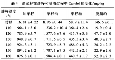 油菜籽芥子堿的變化見表3。隨著炒籽溫度的升高,菜籽油中的芥子堿含量先增加后減少,在150℃時增加了6.7倍。菜籽油中芥子堿含量增加可能是因為經(jīng)過熱處理的油菜籽的壓榨出油率增加。油菜籽中的芥子堿含量逐漸減少,在160℃時減少了26.5%。這可能是由于高溫加工過程會對芥子堿產(chǎn)生影響,溫度升高到一定程度時會使芥子堿發(fā)生部分水解或降解。