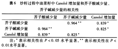 炒籽過程中油菜籽中Canolol增加量和芥子酸減少量、芥子堿減少量的相關(guān)性見表6。油菜籽中的Canolol增加量與芥子酸和芥子堿的減少量均呈顯著正相關(guān)關(guān)系,相關(guān)系數(shù)分別為0.839和0.825(P<0.05),而芥子酸減少量和芥子堿減少量呈極顯著正相關(guān)關(guān)系,相關(guān)系數(shù)為0.964(P<0.01)。這些結(jié)果與張苗等的研究結(jié)果相似,表明Canolol的形成與油菜籽的初始芥子酸、芥子堿的含量以及炒籽過程中芥子酸、芥子堿的減少量有一定的相關(guān)性,且可能有芥子堿也轉(zhuǎn)化為芥子酸并熱脫羧形成了Canolol。