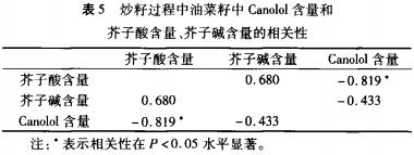 炒籽過程中油菜籽中Canolol含量和芥子酸含量、芥子堿含量的相關(guān)性見表5。在炒籽過程中,油菜籽中的Canolol含量與芥子酸和芥子堿含量均呈負相關(guān)關(guān)系,其中與芥子堿含量呈顯著負相關(guān)關(guān)系,相關(guān)系數(shù)為一0.819(P<0.05),而芥子酸和芥子堿含量呈正相關(guān)關(guān)系。