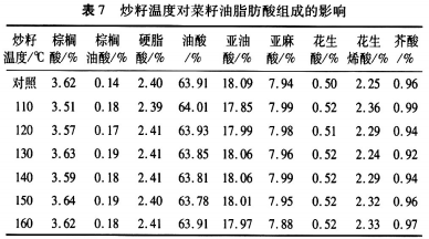 炒籽溫度對菜籽油脂肪酸組成的影響見表7。隨著炒籽溫度的升高,菜籽油的脂肪酸組成沒有發(fā)生明顯的變化,這表明炒籽預處理對菜籽油的脂肪酸組成無顯著影響(P<0.05)。