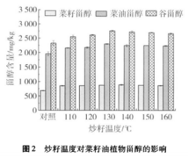 炒籽溫度對菜籽油植物甾醇的影響如圖2所示。隨著炒籽溫度的升高,菜籽油中的菜籽甾醇、菜油甾醇和谷甾醇含量均有所增加,分別在140、130、130℃最高增加了29.2%、17.7%、18.7%。