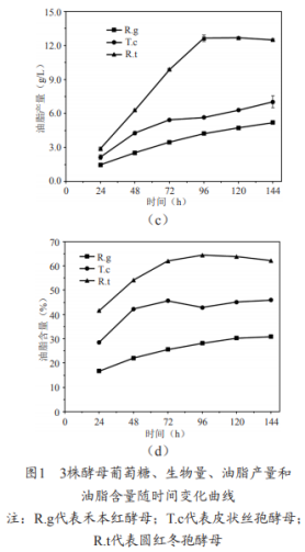 由圖1可知,禾本紅酵母和皮狀絲孢酵母對(duì)葡萄糖的利用規(guī)律相似,圓紅冬孢酵母葡萄糖利用速率最大,120h后糖濃度降為0左右。圓紅冬孢酵母的生物量96h時(shí)可達(dá)19.44g/L。禾本紅酵母到發(fā)酵144h后油脂產(chǎn)量達(dá)5.0g/L以上。皮狀絲孢酵母油脂產(chǎn)量達(dá)7.0g/L左右,圓紅冬孢酵母在96h時(shí)油脂產(chǎn)量為12.5g/L。由此可見油脂積累能力,圓紅冬孢酵母>皮狀絲孢酵母>禾本紅酵母。由表1可看出,圓紅冬孢酵母的油脂得率顯著高于其他兩株產(chǎn)油酵母,這說明圓紅冬孢酵母能將培養(yǎng)基中的葡萄糖高效地轉(zhuǎn)化為油脂。