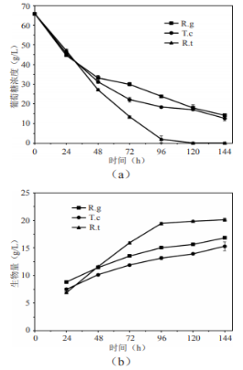 將斜面保藏的3株產(chǎn)油酵母分別接種于YEPD種子培養(yǎng)基中,28℃,200r/min培養(yǎng)24h,以1%(v/v)的接種量接種于YEPD液體培養(yǎng)基中(藥瓶裝液量為1/5),相同條件下培養(yǎng)28h,得到3株產(chǎn)油酵母的種子液。將3株產(chǎn)油酵母種子液分別以10%(v/v)的接種量接種于限氮培養(yǎng)基中,于28℃,200r/min搖瓶培養(yǎng)至還原糖濃度不降低時(shí)結(jié)束發(fā)酵,每隔24h取樣測(cè)定其還原糖濃度、生物量和油脂含量,每組試驗(yàn)設(shè)置兩個(gè)平行樣。