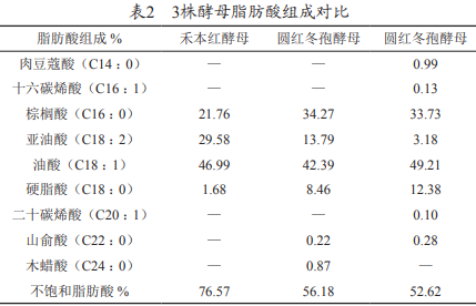 明確油脂的脂肪酸組成是決定其進(jìn)一步開發(fā)和應(yīng)用的關(guān)鍵。3種油脂酵母脂肪酸組成如表2所示。禾本紅酵母脂肪酸種類最少,圓紅冬孢酵母次之,圓紅冬孢酵母脂肪酸種類最多。圓紅冬孢酵母占比最大的為油酸、棕櫚酸和硬脂酸;皮狀絲孢酵母所產(chǎn)油脂中的油酸、棕櫚酸和亞油酸含量最高;禾本紅酵母脂肪酸組成中也是油酸、棕櫚酸和亞油酸含量最高,但比例上存在明顯差異,與文獻(xiàn)報(bào)告結(jié)果相似。由此可見,3株油脂酵母所產(chǎn)油脂主要組成與一般的植物油油脂組成相似。