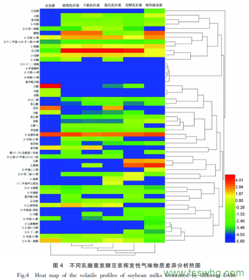 5b所示,未發(fā)酵豆?jié){的特征化合物是壬醛、正辛醛、戊醛、正己醛、正戊烷、反-2-辛烯醛、反,反-2,4-癸二烯醛;植物乳桿菌、干酪乳桿菌、和德氏乳桿菌發(fā)酵豆?jié){的特征化合物是葉醇、仲辛酮、反-2-辛烯醛、(E,E)-2,4-庚二烯醛、3-乙基-2-甲基-1,3-己二烯、3-辛烯-2-酮、(2Z)-2-辛基-1-醇、反式-2-辛烯-1-醇;發(fā)酵乳桿菌發(fā)酵豆?jié){的特征化合物是氯甲酸正辛酯、正庚醇、(2R,3R)-(-)-2,3-丁二醇、3-羥基-2-丁酮、愈創(chuàng)木酚、苯酚;嗜熱鏈球菌兩組發(fā)酵豆?jié){中的特征揮發(fā)性氣味物質(zhì)是苯酚、芳樟醇、愈創(chuàng)木酚、甲基麥芽酚、2-乙酰基噻唑、2-乙基己醇、異戊醇、正辛醇、苯乙醇、環(huán)庚醇、2-壬酮。與文獻報道的發(fā)酵酸豆奶中的風味物質(zhì)——丙酮酸、乙酸、苯甲酸等酸類物質(zhì)含量較高略有差異。