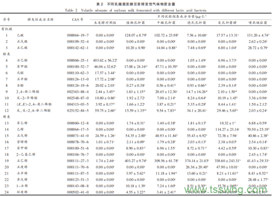 本研究結(jié)果表明:干酪乳桿菌和嗜熱鏈球菌在豆?jié){發(fā)酵過程中的產(chǎn)酸能力較強。5種乳酸菌發(fā)酵豆?jié){均顯著增加了揮發(fā)性氣味物質(zhì)的含量與組成,其中干酪乳桿菌、植物乳桿菌、德氏乳桿菌和發(fā)酵乳桿菌4種乳酸菌發(fā)酵豆?jié){揮發(fā)性氣味物質(zhì)組成相近,與未發(fā)酵豆?jié){、嗜熱鏈球菌發(fā)酵豆?jié){間存在差異。未發(fā)酵豆?jié){的特征揮發(fā)性氣味物質(zhì)是壬醛、正辛醛、戊醛、正己醛、正戊烷、反-2-辛烯醛、反,反-2,4-癸二烯醛。植物乳桿菌、干酪乳桿菌和德式乳桿菌發(fā)酵豆?jié){的特征化合物是葉醇、仲辛酮、反-2-辛烯醛、(E,E)-2,4-庚二烯醛、3-乙基-2-甲基-1,3-己二烯、3-辛烯-2-酮、(2Z)-2-辛基-1-醇、反式-2-辛烯-1-醇。發(fā)酵乳桿菌發(fā)酵豆?jié){的特征化合物是氯甲酸正辛酯、正庚醇、(2R,3R)-(-)-2,3-丁二醇、3-羥基-2-丁酮、愈創(chuàng)木酚、苯酚。嗜熱鏈球菌發(fā)酵豆?jié){的特征化合物質(zhì)是苯酚、芳樟醇、愈創(chuàng)木酚、甲基麥芽酚、2-乙酰基噻唑、2-乙基己醇、異戊醇、正辛醇、苯乙醇、環(huán)庚醇、2-壬酮。