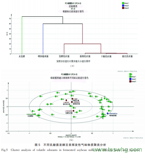 使用多元數(shù)據(jù)分析法能清晰地闡明各發(fā)酵豆?jié){樣本間的差異。將不同菌種乳酸菌發(fā)酵豆?jié){樣品中的所有揮發(fā)性氣味物質(zhì)進行多元數(shù)據(jù)分析,樣本聚類樹分析見圖5。由樣本聚類分析樹狀圖(圖5a)可見,干酪乳桿菌、植物乳桿菌、德氏乳桿菌和發(fā)酵乳桿菌4種乳酸菌發(fā)酵豆?jié){揮發(fā)性氣味物質(zhì)組成相近,與未發(fā)酵豆?jié){、嗜熱鏈球菌發(fā)酵豆?jié){間均存在差異。