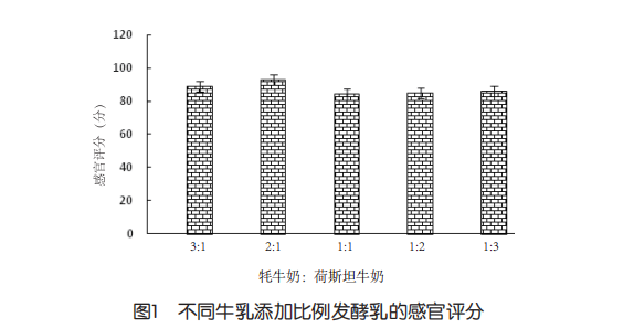 由圖1可知,當(dāng)牦牛奶與荷斯坦牛奶比例為3:1時,發(fā)酵乳質(zhì)地較硬、顏色較黃,符合黃友鷹等的報道,