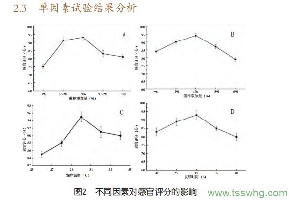 在發(fā)酵過程中,糖添加量、菌種添加量、發(fā)酵溫度和發(fā)酵時間均對發(fā)酵乳感官評分影響較大。用牦牛奶與荷斯坦牛奶比例為2:1進(jìn)行單因素試驗,結(jié)果如圖2所示:
