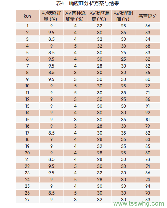 根據(jù)單因素試驗的結(jié)果,建立Box-BehnkenDesign中心組合設(shè)計試驗?zāi)P?,通過擬合二次方程計算最佳工藝組合,選取糖添加量、菌種添加量、發(fā)酵溫度、發(fā)酵時間進(jìn)行4因素3水平響應(yīng)面分析,結(jié)果見表4。