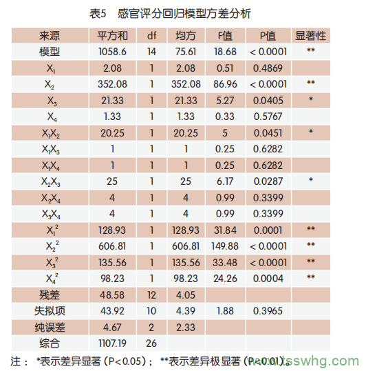 利用Design-Expert8.0.6軟件對表4進(jìn)行多元回歸擬合,得到糖的添加量(X1)、菌種添加量(X2)、發(fā)酵溫度(X 3)、發(fā)酵時間(X 4)的二次方程為Y=92.33+0.42X1-5.42X2+1.33X3-0.33X4+2.25X1X2-0.50X1X3+0.50X1X4-2.50X2X3+1.00X2X4-1.00X3X4-4.92X12-10.67X22-5.04X32-4.29X42?;貧w模型方差分析見表5。