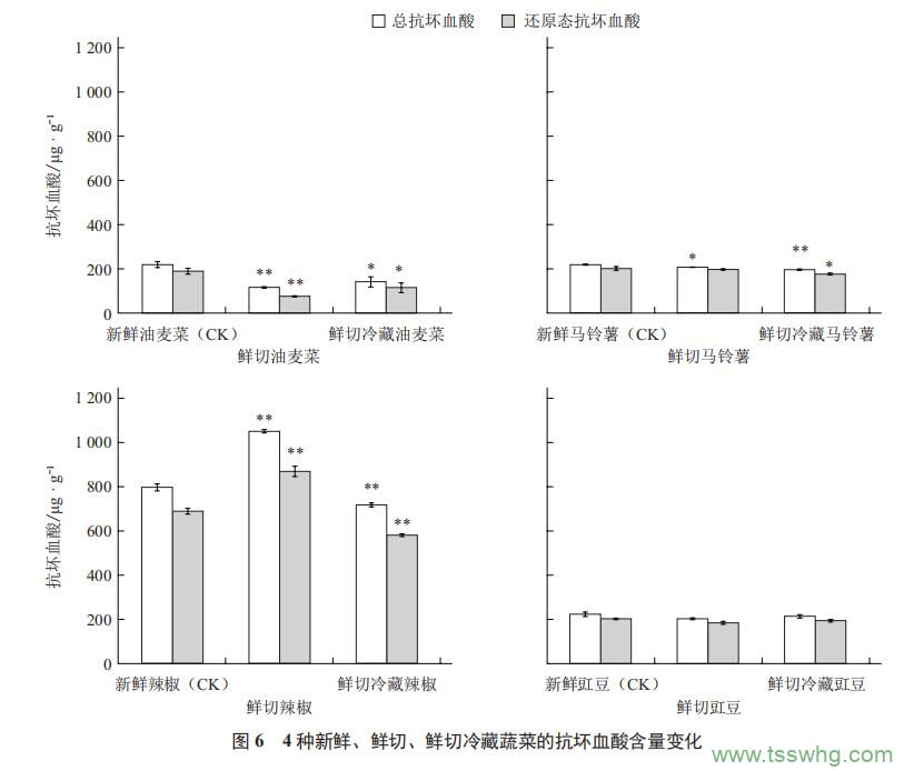 新鮮油麥菜、馬鈴薯、辣椒和豇豆中總抗壞血酸含量分別為219.6、218.9、795.1、223.7μg·g-1(FW)。與新鮮蔬菜相比,油麥菜鮮切及鮮切冷藏后總抗壞血酸含量顯著或極顯著下降47.00%和35.40%,還原態(tài)抗壞血酸含量亦顯著或極顯著降低59.81%和39.35%;馬鈴薯鮮切及鮮切冷藏后總抗壞血酸含量顯著或極顯著下降5.32%和10.31%,還原態(tài)抗壞血酸含量分別降低2.02%和12.69%;辣椒鮮切后總抗壞血酸和還原態(tài)抗壞血酸含量極顯著上升31.89%和26.21%,而鮮切冷藏后總抗壞血酸和還原態(tài)抗壞血酸含量極顯著下降10.02%和15.73%;豇豆鮮切及鮮切冷藏后總抗壞血酸和還原態(tài)抗壞血酸含量無顯著變化(圖6)。