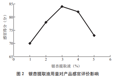 不同銀杏提取液用量對運(yùn)動飲料的感官評價影響,見圖2所示。從圖2可知,隨著銀杏提取液用量增多,運(yùn)動飲料感官評價結(jié)果先升高后降低,當(dāng)銀杏提取液用量達(dá)到3%時,兩種原料的顏色達(dá)到協(xié)調(diào),且銀杏香味不易被掩蓋,因此選擇銀杏提取液用量2%、3%、4%作為正交試驗考察水平。