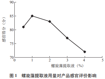不同螺旋藻提取液用量對運(yùn)動飲料的感官得分影響,見圖1所示。從圖1可知,當(dāng)螺旋藻提取液用量為1%時,感官得分最高,此時溶液呈淡黃綠色,螺旋藻氣味突出,當(dāng)用量增大時,溶液顏色加深,混濁感明顯,因此選擇螺旋藻提取液用量0.5%、1%、2%作為正交試驗考察水平。