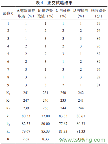 從表4可知,R2>R3>R1>R4,即各因素對螺旋藻銀杏運(yùn)動飲料的感官評價影響順序為:銀杏提取液用量>白砂糖用量>螺旋藻提取液用量>檸檬酸用量,通過極差分析可知,該飲料的基礎(chǔ)配方最佳參數(shù)為A2B3C1D3。在螺旋藻提取液1%,銀杏提取液4%,白砂糖2%,檸檬酸0.4%的基礎(chǔ)配方下,制得的運(yùn)動飲料感官評分為91分,此時溶液呈淺黃綠色,螺旋藻與銀杏氣味協(xié)調(diào),有清香味,酸甜可口、適宜。