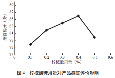 檸檬酸具有抗氧化作用,有助于提高飲料的穩(wěn)定性并豐富口感。不同檸檬酸的用量對運(yùn)動飲料的感官評價影響,見圖4所示。當(dāng)檸檬酸用量為0.3%時,運(yùn)動飲料酸甜適宜,若添加過多,則導(dǎo)致溶液酸度偏高,影響口感,因此選擇檸檬酸用量為0.2%、0.3%、0.4%作為正交試驗影響因素水平。