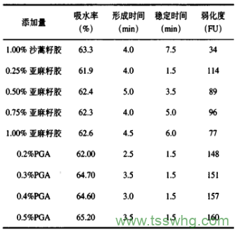 利用Mixolab2混合實驗儀分析面粉的品質(zhì)。根據(jù)GB2760和生產(chǎn)實際將(0.2%、0.3%、0.4%、0.5%)黃原膠、(0.5%、1.0%、1+5%、2.0%)瓜爾豆膠、(0.25%、0.50%、0.75%、1.00%)沙嵩籽膠、(0.25%、0.50%、0.75%、1.00%)亞麻籽膠和(0.2%、0.3%、0.4%、0.5%)PGA分別添加到面粉中,其中面粉與多糖的總重是50g。采用標準實驗模式測定吸收率、形成時間、穩(wěn)定時間和弱化度等。