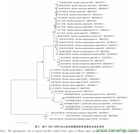 經(jīng)形態(tài)學(xué)觀察和16SrDNA測(cè)序比對(duì),共分離得到54株芽孢菌。由圖1可知,54株芽孢菌中有17株解淀粉芽孢桿菌,14株枯草芽孢桿菌,11株地衣芽孢桿菌,1株莫海威芽孢桿菌,2株短小芽孢桿菌、甲基營(yíng)養(yǎng)型芽孢桿菌、龍舌蘭桿菌和沙福芽孢桿菌,其中解淀粉芽孢桿菌、枯草芽孢桿菌和地衣芽孢桿菌均為山西老陳醋醋酸發(fā)酵階段的優(yōu)勢(shì)芽孢菌,分別占芽孢菌的31.36%,26.26%,20.59%。通過(guò)構(gòu)建系統(tǒng)進(jìn)化樹(shù)(圖2)可知,解淀粉芽孢桿菌和枯草芽孢桿菌、甲基營(yíng)養(yǎng)型芽孢桿菌的親源性關(guān)系較近,而與地衣芽孢桿菌的親源性關(guān)系更近,達(dá)99%,另外,短小芽孢桿菌、沙福芽孢桿菌聚類在另一個(gè)分支。典型芽孢菌的菌落形態(tài)和細(xì)胞形態(tài)描述見(jiàn)表1。