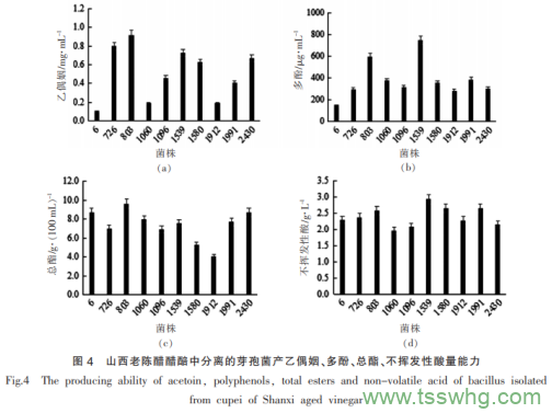 從醋醅中分離純化得到54株芽孢菌菌株,測(cè)定芽孢菌發(fā)酵液的乙偶姻、多酚、總酯、不揮發(fā)性酸能力。各能力均較高的10株芽孢菌的乙偶姻、多酚、總酯、不揮發(fā)性酸含量如圖4所示,其中枯草芽孢桿菌803產(chǎn)乙偶姻、總酯含量最高,解淀粉芽孢桿菌1539產(chǎn)多酚、不揮發(fā)酸含量最高。