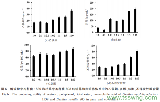 由圖6可知,以解淀粉芽孢桿菌1539和枯草芽孢桿菌803純培養(yǎng)(1:0和0:1)為對照,研究解淀粉芽孢桿菌1539和枯草芽孢桿菌803比例分別為1:0,0:1,1:0.1,1:0.5,1:1,1:5,1:10(V/V)共培養(yǎng)時對乙偶姻、多酚、總酯、不揮發(fā)酸含量的影響。解淀粉芽孢桿菌1539和枯草芽孢桿菌803在純培養(yǎng)(1:0和0:1,V/V)條件下的乙偶姻、總酯含量接近,低于解淀粉芽孢桿菌1539和枯草芽孢桿菌803共培養(yǎng)的含量,并且隨著枯草芽孢桿菌803比例的增加,乙偶姻、總酯含量逐漸增大,當解淀粉芽孢桿菌1539和枯草芽孢桿菌803按1:10(V/V)共培養(yǎng)時乙偶姻、總酯含量最高,分別比純培養(yǎng)提高了96.23%、12.08%。