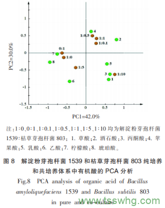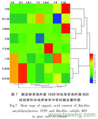 有機酸是山西老陳醋總酸中的重要成分,可以緩和陳醋的刺激性,使酸味柔和。以解淀粉芽孢桿菌1539和枯草芽孢桿菌803純培養(yǎng)為對照,研究共培養(yǎng)相互作用對芽孢菌有機酸含量的影響。由圖7、圖8可知,解淀粉芽孢桿菌1539和枯草芽孢桿菌803在純培養(yǎng)(1:0和0:1,V/V)時,二者的有機酸譜相似,檸檬酸和琥珀酸含量最高;在共培養(yǎng)時,二者比例為1:0.1,1:0.5,1:1(V/V)的有機酸譜相似。解淀粉芽孢桿菌1539和枯草芽孢桿菌803為1:0.5(V/V)共培養(yǎng)時的蘋果酸含量最高;二者比例為1:10(V/V)共培養(yǎng)時,草酸、丙酮酸、酒石酸、乳酸的含量都顯著升高,分別比純培養(yǎng)(1:0,V/V)時提高89.78%,88.32%,22.92%,32.98%,它們可以緩沖乙酸帶來的刺激酸味,使醋的口感變得柔和,其中丙酮酸具有愉快的香味和帶有微辣的甜味,可豐富陳醋的口感;乳酸與醇類物質酯化生成脂類物質,如乳酸乙酯,可以很好地改善陳醋的風味。
