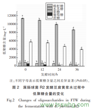 2為屎腸球菌R2發(fā)酵豆腐黃漿水過程中低聚糖含量的變化規(guī)律。新鮮豆腐黃漿水中5種糖的含量為19418.22mg/L,其中水蘇糖和蔗糖含量較高,水蘇糖含量占5種糖含量的58%,蔗糖含量占5種糖含量的30%,棉籽糖、葡萄糖和果糖的含量相對較低。在屎腸球菌R2發(fā)酵豆腐黃漿水的過程中,低聚糖含量均有不同程度的下降。發(fā)酵12h后,葡萄糖的含量迅速下降,利用率達到43%,其次為棉籽糖和果糖,利用率均為17%,水蘇糖和蔗糖的利用率較低,分別為4%和3%;發(fā)酵24h后葡萄糖基本利用完畢,無法檢出。此時,果糖的利用率達到68%,棉籽糖的利用率達到22%,水蘇糖和蔗糖的利用率均為12%。表明屎腸球菌R2在發(fā)酵豆腐黃漿水時優(yōu)先利用葡萄糖,其次為果糖和棉籽糖;發(fā)酵36h后,果糖的含量幾乎沒有發(fā)生變化(P<0.05),蔗糖的利用率達到31%,棉籽糖和水蘇糖的利用率分別為38%和24%。因此,經過屎腸球菌R2的發(fā)酵作用,可以有效地緩解棉籽糖和水蘇糖引起的胃脹氣。