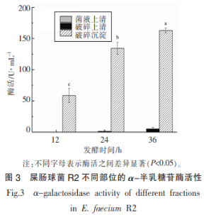 棉籽糖和水蘇糖的代謝需要α-半乳糖苷酶,研究表明,鼠李糖乳桿菌(Lactobacillusrhamnosus)、干酪乳桿菌(Lact.casei)、植物乳桿菌(Lactplantarum)、發(fā)酵乳桿菌(Lact.fermentum)、短乳桿菌(Lact.sbrevis)、布氏乳桿菌(Lact.buchneri)、腸膜明串株菌(Leuconostocmesenteroides)和羅伊氏乳桿菌(Lact.reuteri)等在發(fā)酵的過程中可以分泌α-半乳糖酶,將α-半乳糖苷類寡糖水解為可消化的糖類。屎腸球菌R2不同部位的α-半乳糖苷酶酶活見圖3。如圖3所示,菌液上清酶活幾乎為零,說明α-半乳糖苷酶沒有被分泌到細胞外,屎腸球菌R2的α-半乳糖苷酶不是胞外酶;細胞破碎并離心后,細胞破碎上清和破碎沉淀均具有酶活,說明屎腸球菌R2的α-半乳糖苷酶屬于胞內酶;細胞破碎沉淀酶活顯著高于破碎上清酶活,說明該酶以可溶性蛋白和不可溶性蛋白兩種形式存在,且主要以不可溶性蛋白形式為主。這一結果與Ames等的研究一致,其研究表明大多數(shù)α-半乳糖苷酶位于G+陽性菌細胞質中。Mital等研究證明乳酸菌所產生的α-半乳糖苷酶類的活性范圍在pH4.5~8.0,而屎腸球菌R2發(fā)酵36h后pH下降到3.58(圖1),嚴重偏離了該酶的最適pH,這導致了豆腐黃漿水中棉籽糖和水蘇糖被部分分解(圖2),而不是被全部降解,這一結果與付亭亭等的研究一致。