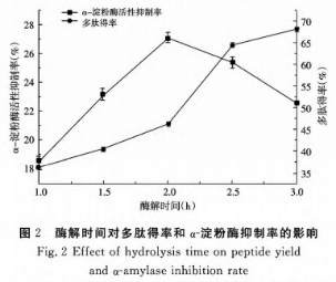 由圖2可知,隨著酶解時間的延長,多肽得率逐漸升高,這說明在蛋白液濃度一定的條件下,酶解時間的延長使酶與蛋白質(zhì)的作用時間越充分,蛋白質(zhì)被水解的程度大,生成小分子片段的短肽越多,從而其多肽含量逐漸升高。在1~3h之間酶解速率逐漸增加,在酶解初期,蛋白液中殘留的多糖、大分子蛋白會沉淀在燒杯底部,隨著酶與底部大分子蛋白充分接觸,酶解速率迅速增加。α-淀粉酶活性抑制率出現(xiàn)先升高后降低的趨勢,在酶解時間為2h時,α-淀粉酶活性抑制率達(dá)到最大值27.1%,隨著酶解的持續(xù)進(jìn)行,之前酶解得到的α-淀粉酶抑制肽被酶解為更小分子的肽段,從而活性抑制率降低??紤]兩種酶解試驗(yàn)結(jié)果,選擇酶解時問2h為最佳。
