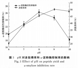 pH的改變影響了酶的最適反應(yīng)條件,易使酶失活和降解,進(jìn)而造成酶解反應(yīng)的中止。由圖3可知,多肽得率和α-淀粉酶活性抑制率都出現(xiàn)了先升高后下降的趨勢,在pH8.0時多肽得率和α-淀粉酶活性抑制率都達(dá)到最高值,之后曠淀粉酶抑制率迅速減小,多肽得率趨于平緩并略有減小,由于過酸過堿的環(huán)境會使酶的活性部位遭到破壞或解離,pH對酶解效果至關(guān)重要。因此,選定胰蛋白酶的酶解pH為8.0進(jìn)行酶解。